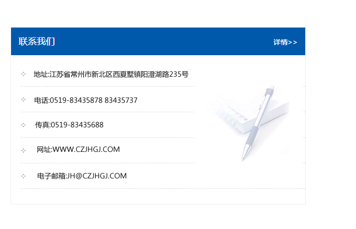 地址:常州市新北區友邦商務大廈1幢16、17層  電話:0519-85101652  傳真:0519-85112595  郵編:213022  網址:www_cz-jiayue_cn.qdtianlang.com  郵箱:xiajifengaa@163.com